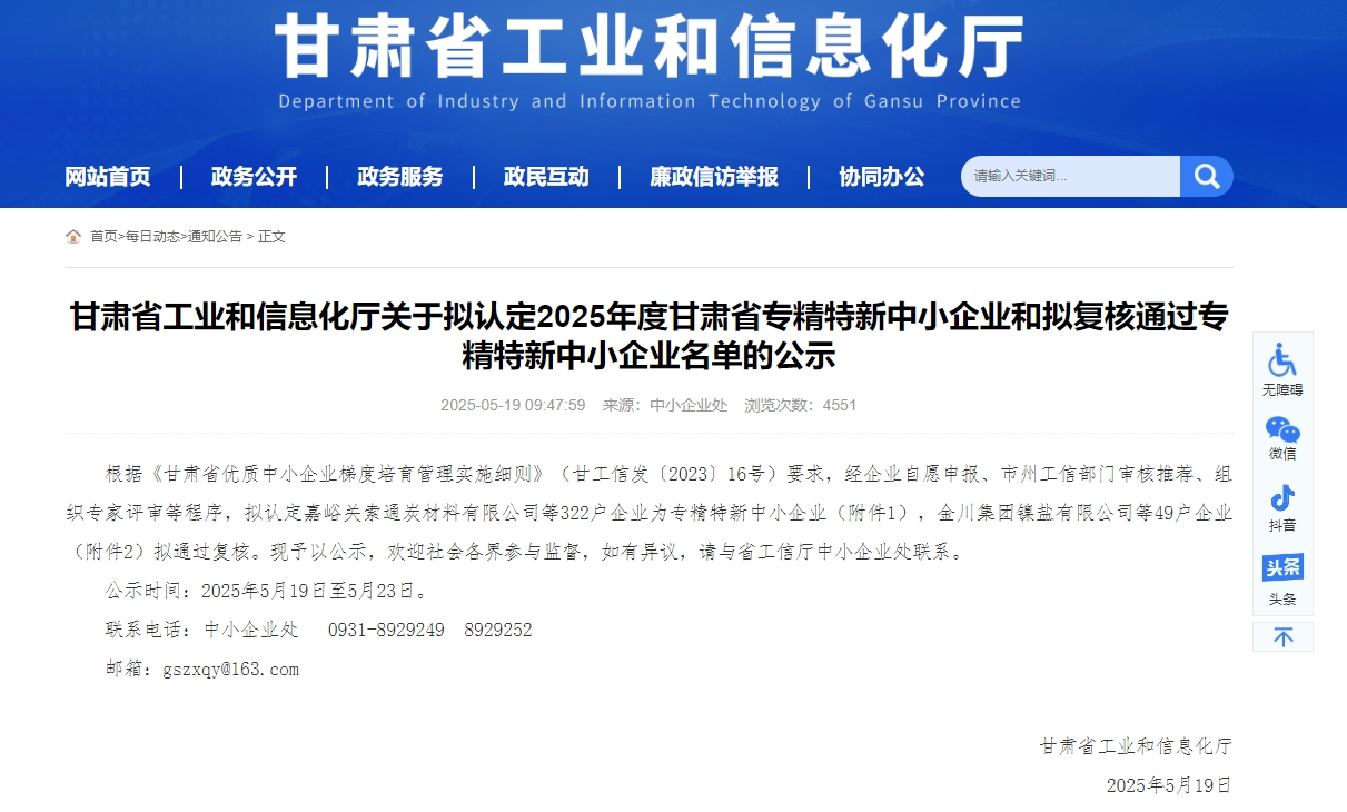 热烈祝贺白银时代瑞象新材料科技有限公司被新认定为2025年甘肃省专精特新中小企业!