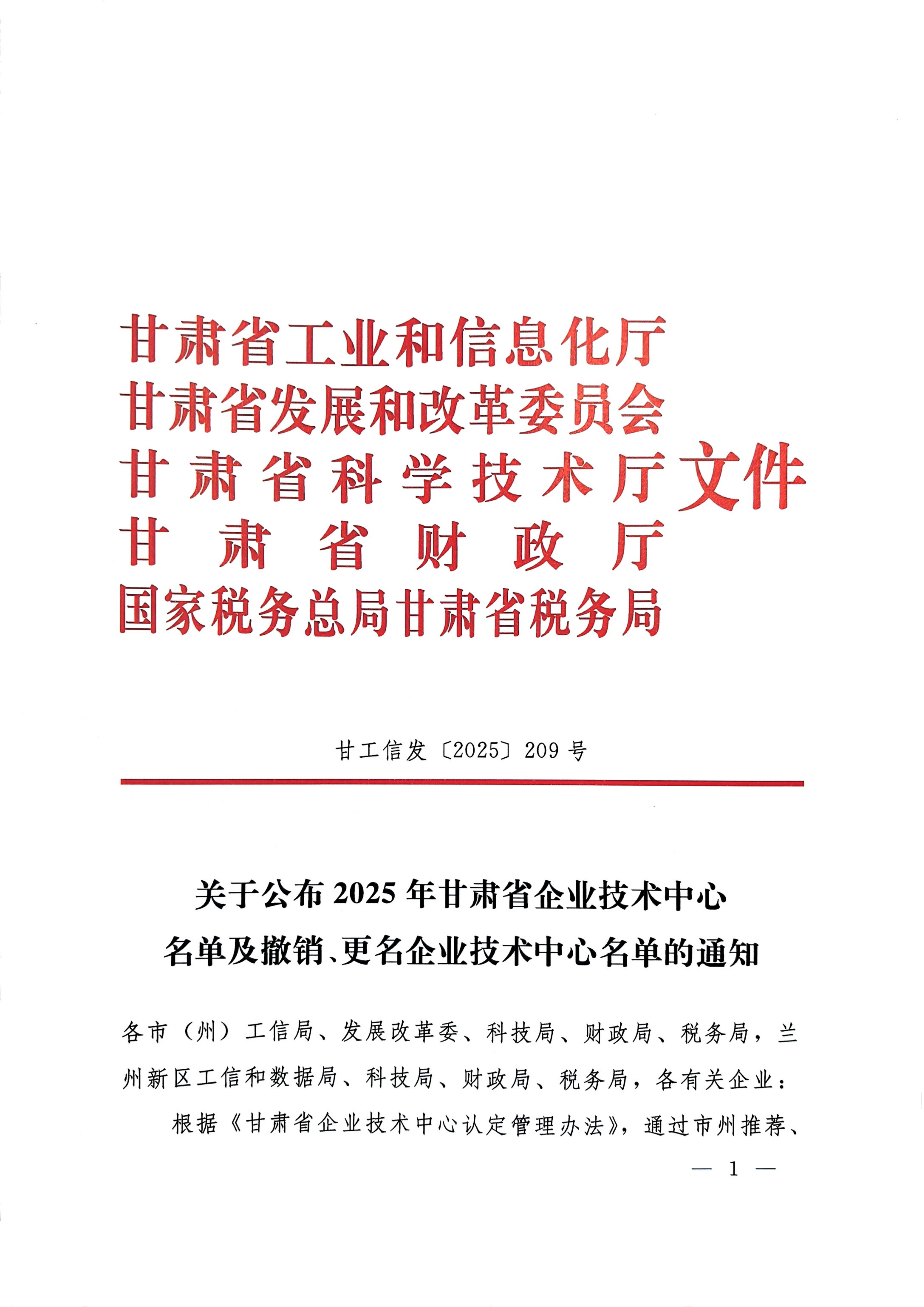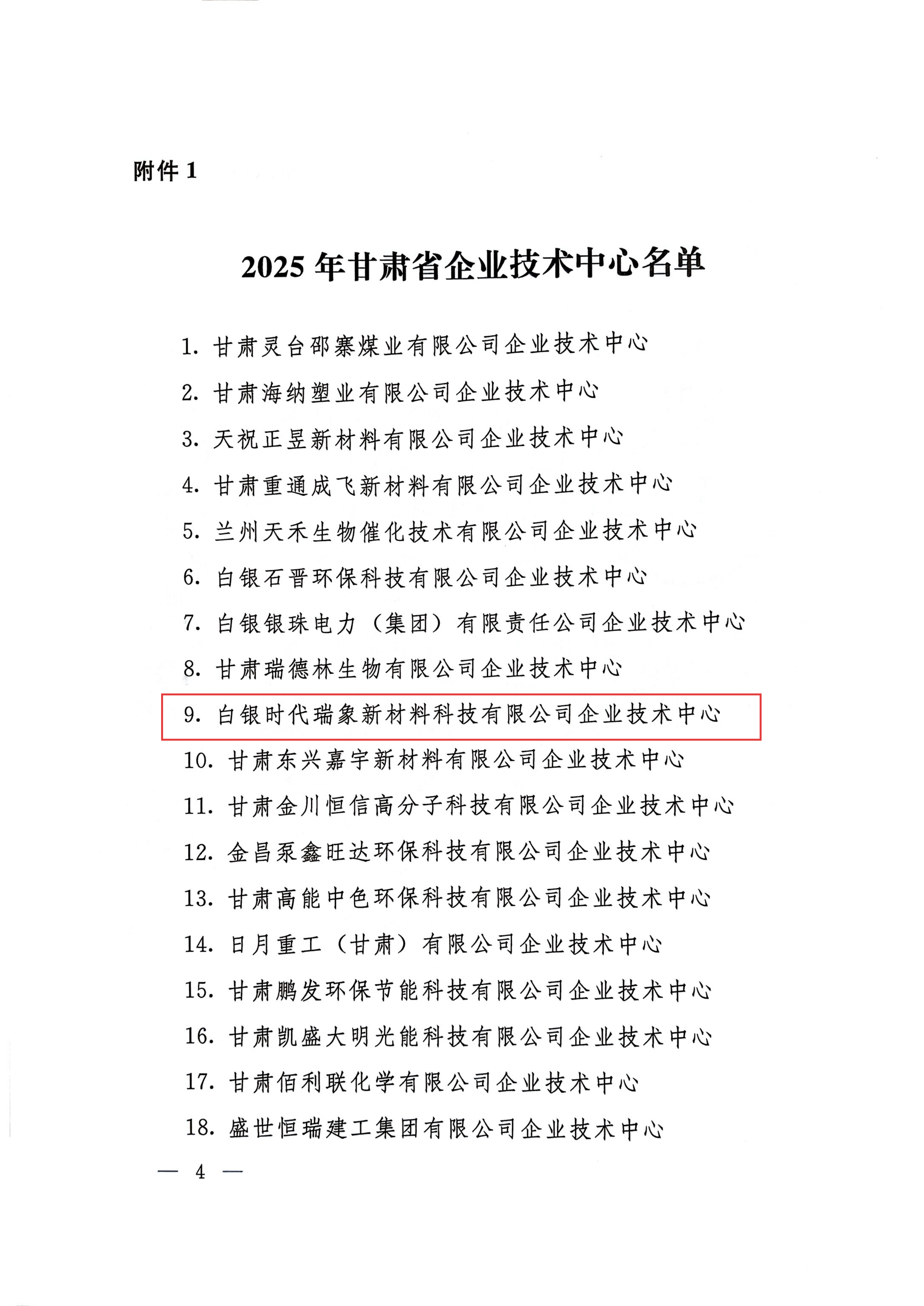 2025年9月25日,甘肃省工业和信息化厅公布了2025年省级企业技术中心认定名单,白银时代瑞象新材料科技有限公司成功获批省级企业技术中心。