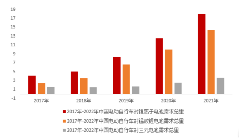 据SMM调研分析，2017年，中国电动自行车对锂离子电池的需求总量为4GWh，其中，对三元电池与锰酸锂电池的需求占比分别为40%、60%。SMM预计，由于目前电动自行车市场保有量巨大，在新国标正式实施后，电动自行车对锂离子电池的需求会逐年增长，预计在2021年达到20GWh。同时，锰酸锂电池在电动自行车中的应用比例会逐年增加，到2021年，锰酸锂电池的应用比例达到80%。