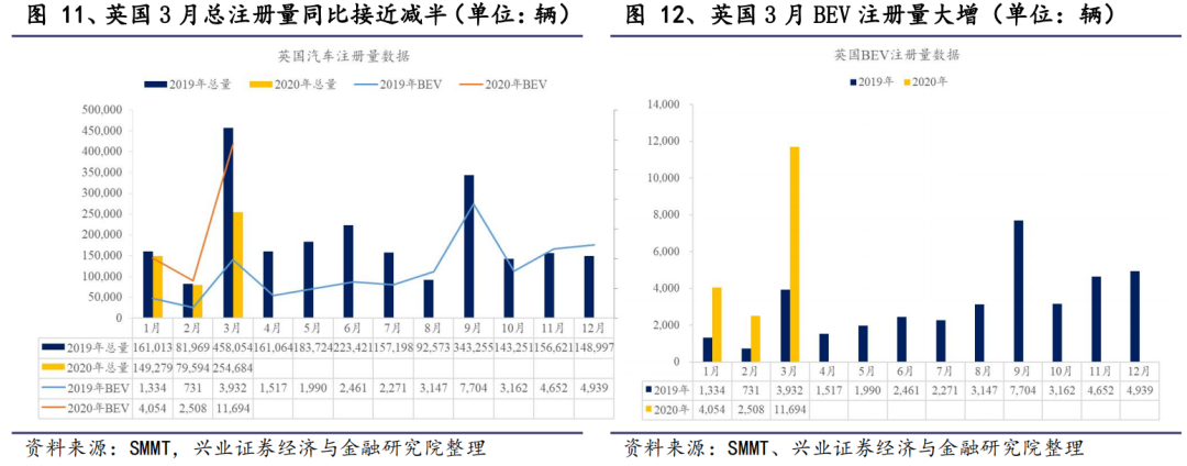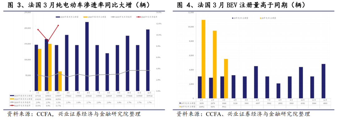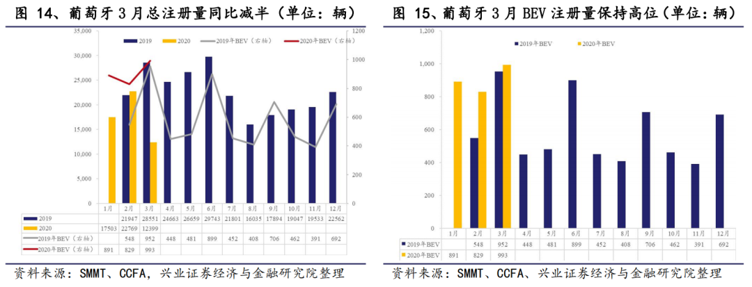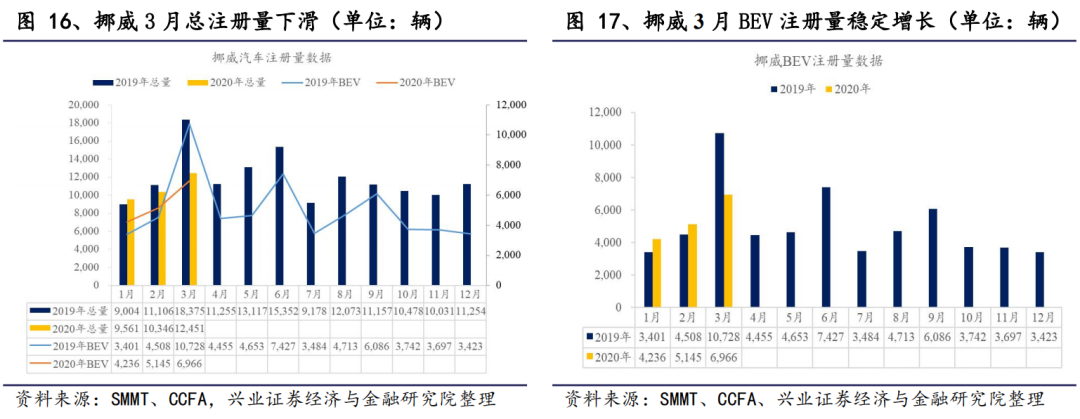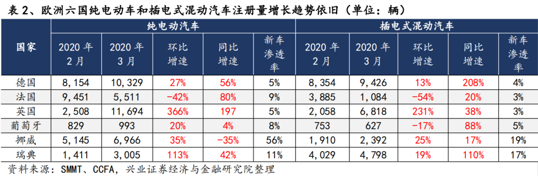 <p style="text-align: left;">&nbsp;&nbsp;&nbsp;&nbsp;&nbsp;&nbsp;&nbsp; &nbsp;3月乘用车注册量数据来看，受疫情影响，乘用车整体增速下滑较大，其中德国和葡萄牙同比下降在55%左右，英国同比下降在45%左右，挪威、德国同比下降在35%左右。反观新能源汽车，注册量继1、 2月持续放量后，3月依然保持强劲增长，其中德国的插混汽车同比增速超2倍，瑞典插混车型同比增速均超过1倍，法国纯电动车和葡萄牙插混车同比增速均接近1倍。整体乘用车注册量的下滑叠加纯电动车和插混车注册量的持续增长带动渗透率进一步提高，其中挪威依然保持着全球最高的存量和增量的渗透率，3月纯电动车渗透率由2月的50%增加到56%，而插混车也达到19%。同时瑞典3月表现亮眼，插混车渗透率高达17%，紧随挪威。法国的纯电动车渗透率也快速提高至9%。英国渗透率不高但增速抢眼，纯电动车和插混车环比增速均超200%，远超其余各国。