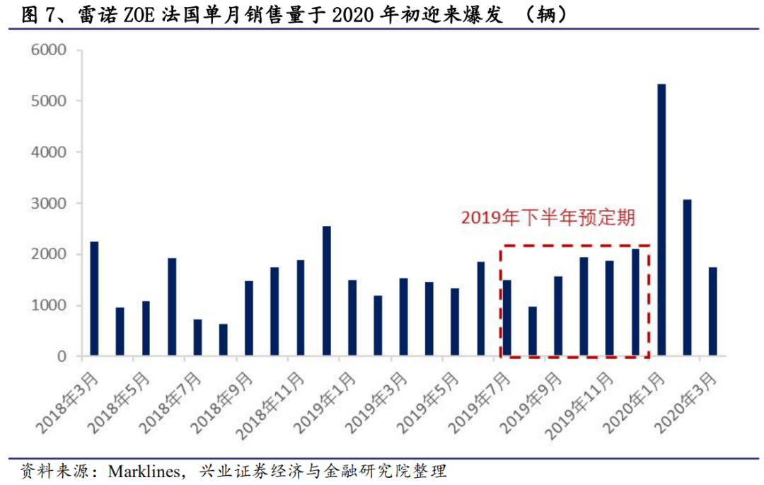 <p style="text-align: left;">&nbsp;&nbsp;&nbsp;&nbsp;&nbsp;&nbsp;&nbsp;&nbsp; 追踪2017-2020年ZOE在法国的月度销量数据，可以看出2019年下半年ZOE的销售增量相对不明显，这归因于新款ZOE从2019年7月开始预定，到2020年1月开始交付，因此2019年的订单于2020年一季度开始交付，ZOE注册增量明显。