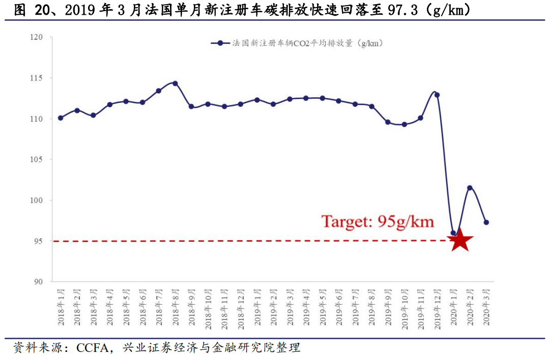&nbsp;&nbsp;&nbsp;&nbsp;&nbsp;&nbsp;&nbsp; 欧洲新能源汽车的发展推力很大程度上来自于欧盟强有力的“碳排放法规”的驱动。法国自2018年1月到2019年12月以来的CO2排放量总体上保持一个较高且平稳的态势， 2019年全年单车碳排放量约为112g/km，距离21年排放目标95g/km仍有较大差距。继2020年1-2月法国纯电动车注册量激增后，3月电车注册量仍保持迅猛之势，可以体现车企对碳排放法规严阵以待，表明认可法规在欧洲的执行。根据CCFA官网数据，在法国2020年2月全国单车平均CO2小幅回升至101.5g/km后，3月快速回落至97.3，同比下降11.9%，相比2019年，纯电动销量暴增带来碳排放下降明显。