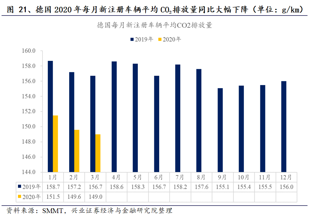 &nbsp;&nbsp;&nbsp;&nbsp;&nbsp;&nbsp;&nbsp; 德国方面，2019年CO2排放量总体上保持在一个非常高且平稳的态势， 2019年全年单车碳排放量约为157g/km，距离21年排放目标95g/km有很大差距。因此，2020年前3个月德国乘用车整体下滑但纯电动车注册量逆势增长，可以体现碳排放法规对车企形成实质压力。根据最新数据显示，德国2020年1-2月全国单车平均CO2连续下降达149.6g/km后，3月全国单车平均CO2继续下降至149g/km。乘用车销售结构的变化带来碳排放开始呈现下降趋势，但与21年95g/km还有较大差距，预计未来各家车企将加大新能源汽车的投放。