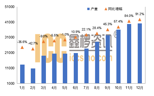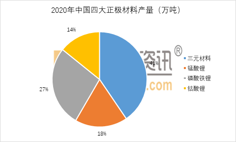 <p>&nbsp; &nbsp; &nbsp; &nbsp; 据ICC鑫椤资讯统计数据显示，2020年国内四大正极材料总产量51.9万吨，同比增长20.8%，其中磷酸铁锂材料表现强势，产量达到14.2万吨，同比增长45.7%。钴酸锂与锰酸锂正极材料的产量分别为7.38万吨及9.29万吨，同比分别增长24.8%及21.6%；三元材料产量增速最缓，仅7%，全年总量为21万吨。</p>