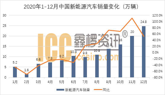 新能源汽车|同比增速超过10%,2020年中国新能源汽车销量136.7万辆
