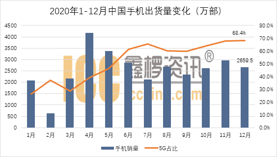 据中国信通院数据,2020年12月,国内手机总体出货量2659.5万部,同比下降12.6%。2020年全年,1-12月,国内手机市场总体出货量累计3.08亿部,同比下降20.8%;其中5G手机累计出货量1.63亿部,占手机总出货量的52.9%。