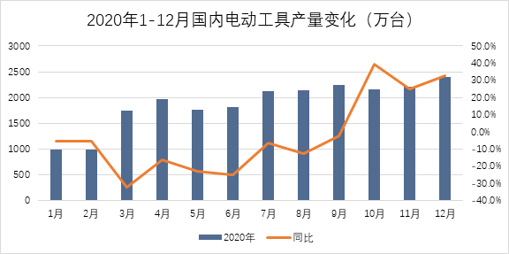 据国家统计局数据显示,2020年12月,国内电动手提式工具产量为2395万台,同比增长24.2%,环比小增8.8%。2020年全年,国内电动手提式工具总产量为2.22亿台,同比增长7%。