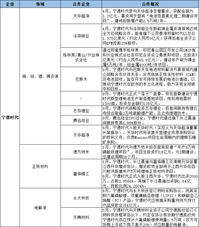 据不完全统计,宁德时代直接或间接参股的上游材料企业超过20家,通过控股、兼并购、深度绑定以加深对锂电池上游原材料的掌控。