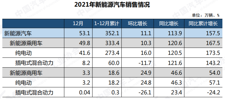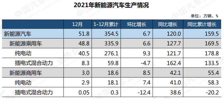 1月12日，中汽协发布数据，2021年1-12月我国新能源汽车累计产量354.5万辆，同比增长159.5%；销量352.1万辆，同比增长157.5%。