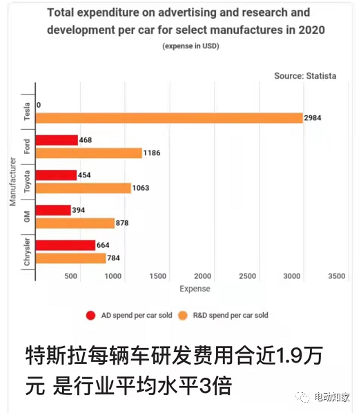 值得注意的是，3月25日StockApps.com公布了一份各大车企平均车辆研发费用的报告，其中特斯拉汽车以2984美元（约合人民币1.9万元）的成本遥遥领先，是汽车产业行业平均水平的三倍。</p>