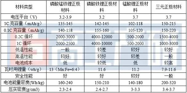 <p style="text-align: center;">磷酸锰铁锂与其它正极材料的性能对比</p>