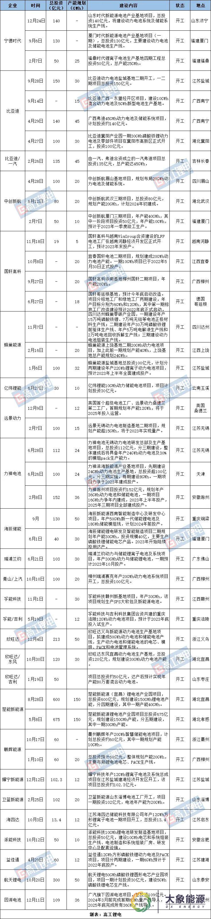 与火热的市场需求相比,动力电池产能扩张则显得更为激进。高工锂电据不完全统计显示,2022年至今,动力及储能电池开工项目达44个,总产能规划超1.2TWh,规划投资超4300亿元;而动力电池竣工投产的项目也达到16个。