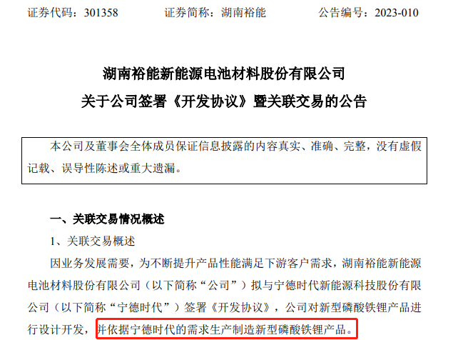 3月16日,湖南裕能发布公告称,拟与宁德时代签署《开发协议》,对新型磷酸铁锂产品进行设计开发,并依据宁德时代的需求生产制造新型磷酸铁锂产品。