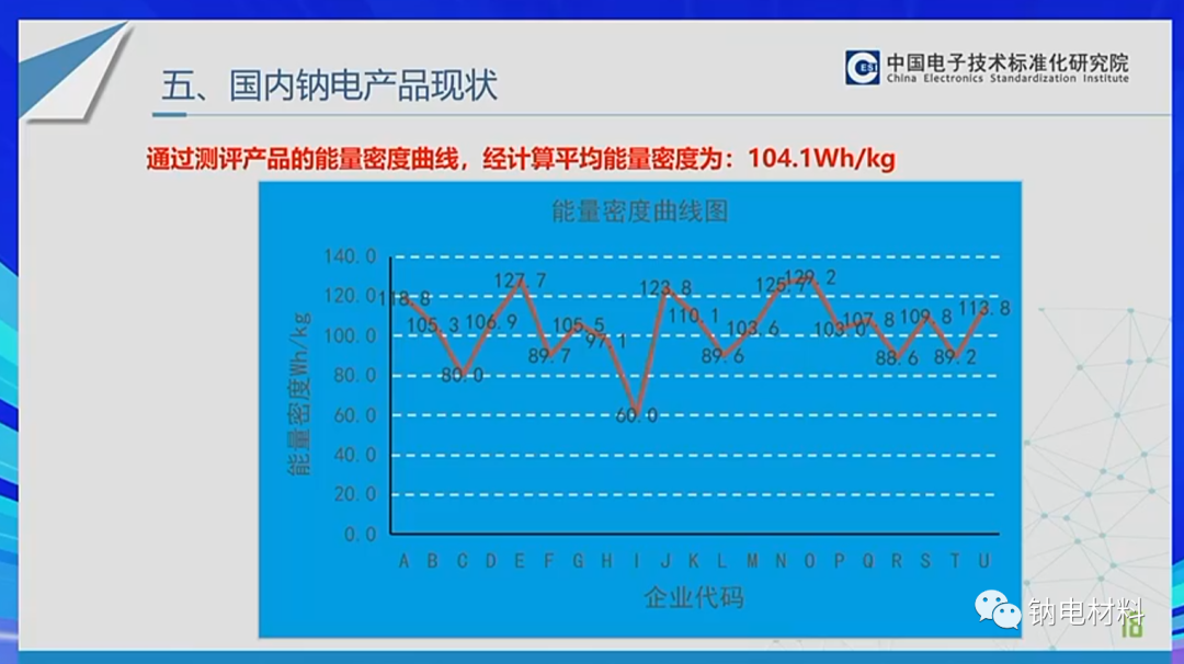 据统计，参评电池的平均能量密度为104.1Wh/kg，最高的四家在120-130Wh/kg。相比于磷酸铁锂电池150Wh/kg的能量密度仍存在一些差距，但已数倍于铅酸电池约30Wh/kg的能量密度。