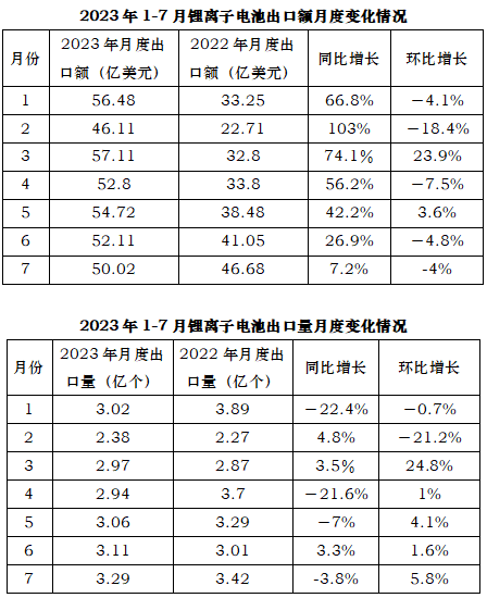 <p>2023年1-7我国锂离子电池累积出口额为370.45亿美元，2022年同期为248.69亿美元，同比增长49%；2023年上半年我国锂离子电池累积出口数量为20.75亿个，2022年同期为22.44亿个，同比减少7.5%。其中，2023年7月锂离子电池出口额为50.02亿美元，同比增长7.2%，环比减少4%；2023年7月锂离子电池出口数量为3.29亿个，同比减少3.8%，环比增长5.8%。