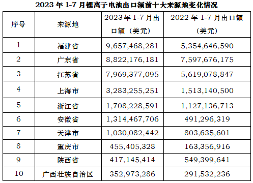 2023年1-7月美国仍然是我国锂离子电池最大出口目的地，出口美国金额为71.94亿美元，同比增长50.6%。