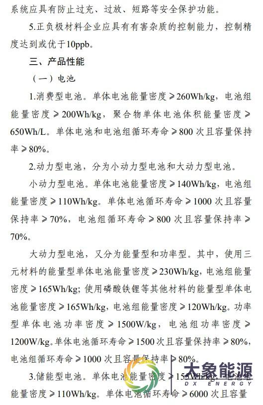 大动力型电池,又分为能量型和功率型。其中,使用三元材料的能量型单体电池能量密度≥230Wh/kg,电池组能量密度≥165Wh/kg;使用磷酸铁锂等其他材料的能量型单体电池能量密度≥165Wh/kg,电池组能量密度≥120Wh/kg。功率型单体电池功率密度≥1500W/kg,电池组功率密度≥1200W/kg。单体电池循环寿命≥1500次且容量保持率≥80%,电池组循环寿命≥1000 次且容量保持率≥80%。